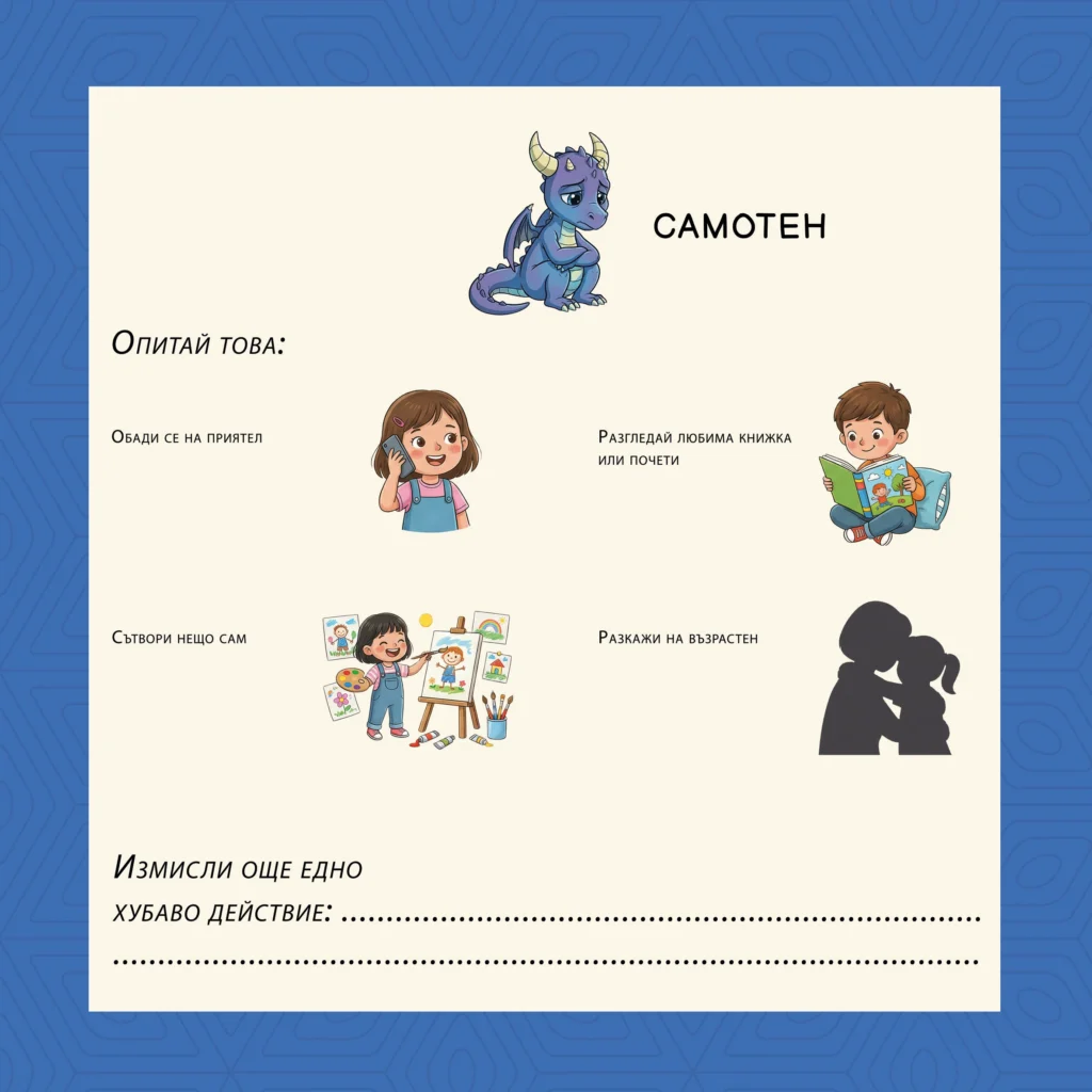 В 3 лесни стъпки: 1. Детето избира емоцията по картинка. 2. Обръщате страницата и виждате какво да направите. 3. Избирате една идея и я правите веднага. Това е за моментите “сега”, когато няма време за дълги обяснения.