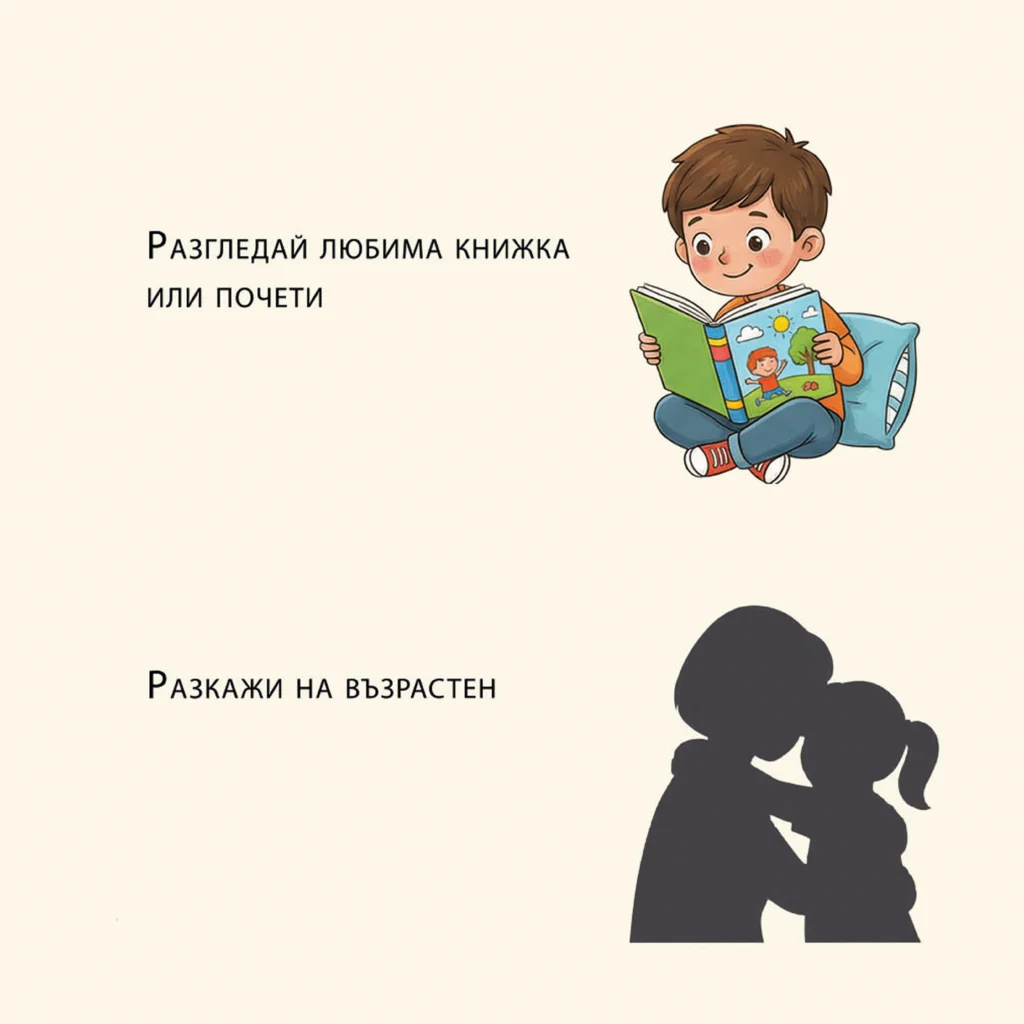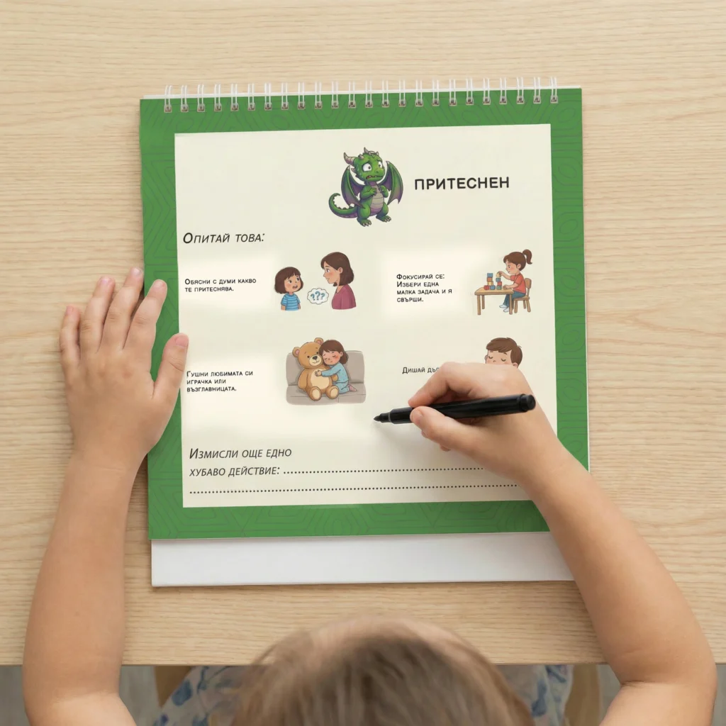 Обръщте страницата и виждате какво да направите веднага. Когато емоцията стане силна, детето не се обърква, а знае какво да направи.